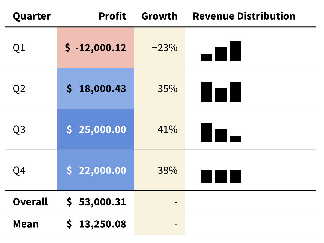 Need more than just text color? Typst lets you colorize cells or even add little charts to your tables.